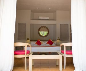 Inside one finds an environment of simplistic elegance along with tropically themed furnishings and bedding.